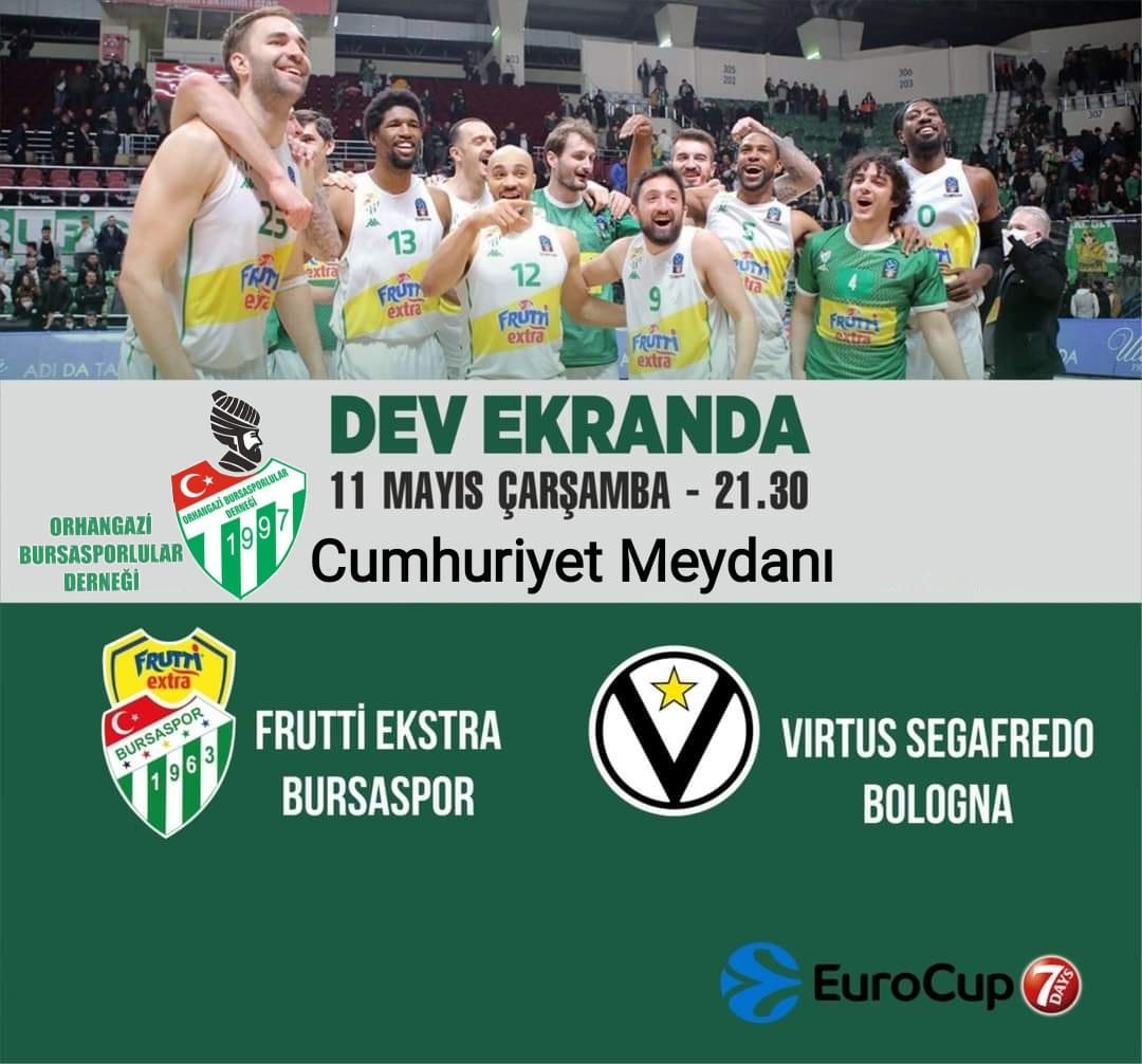 Orhangazi Bursasporlular Derneği , Eurocup’ta mücadele eden Frutti Extra Bursaspor’un, İtalyan takımı Virtus Segafredo Bologna ile oynayacağı final maçını dev ekranda canlı yayınlayacak.