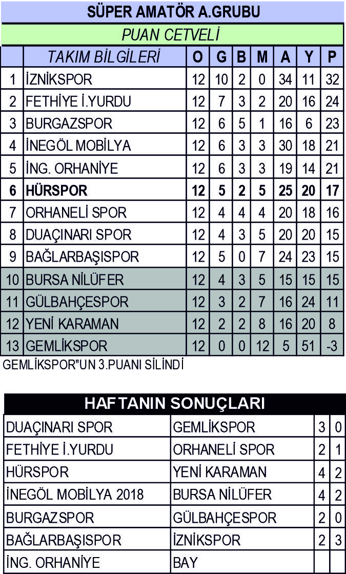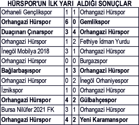 Hürspor ligin 4. haftasında ilk mağlubiyetini kendi evinde Fethiye İdman Yurduspor’dan alan sarı yeşilliler İnegöl Mobilyaspor, İnegöl Orhaniyespor ,İznikspor ve Bursa Nilüfer Spor’a mağlup olurken; Gemlikspor ,Duaçınarı Spor, Bağlarbaşı Spor, Gülbahçespor ve Yeni Karamanspor karşılaşmalarında galibiyet sevinci yaşadı. Hürspor, Orhanelispor ile Burgazspor karşısında beraberlikle haftayı kapatmıştı. Hürspor sezona teknik direktör Salih Ünal’la başlamıştı. Ligin 5. haftasında İnegöl Mobilyspor karşılaşmasının ardından istifa eden Salih Ünal’ın yerine Servet Renda Hürspor’un başına geçireeb temsilcimiz ilk yarıda oynadığı 12 maçta, 5 galibiyet, 2 mağlubiyet ve 5 mağlubiyet aldı. Hürspor 17 puanla grupta 6.sırada yer alıyor